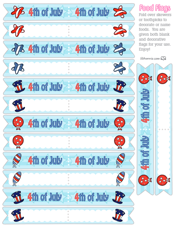 Print out these fun and colorful 4th of July food flags.  I have created some with 4th of July on them to put on various foods that don’t need a name and some are blank for you to write in names for those dishes that might keep guests guessing.  Happy printing!